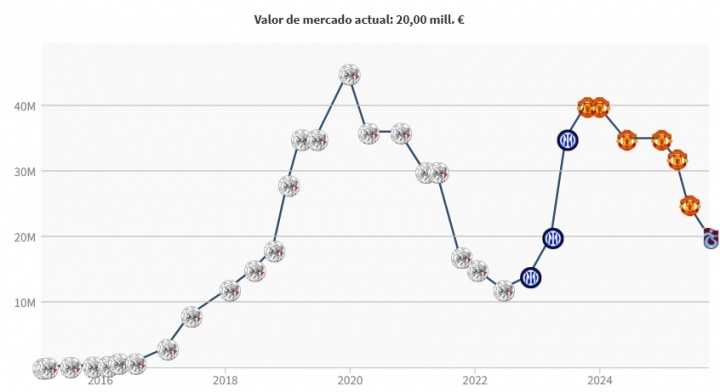 奥纳纳2023年夏窗以5000万欧元从国米转会曼联,其时他的身价为3500万欧元。加盟曼联后奥纳纳的身价涨至4000万欧元,而后屡次下落。