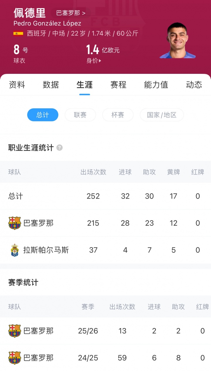 佩德里本赛季已为巴萨出战13场比赛,总出场技术1099分钟,而上个赛季佩德里为巴萨的出场次数达到了可怕的59场,谋略4646分钟。