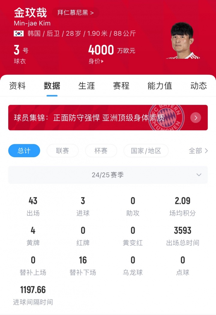 金玟哉现年28岁,他上赛季为拜仁出场43次,孝敬3粒进球,现身价4000万欧。