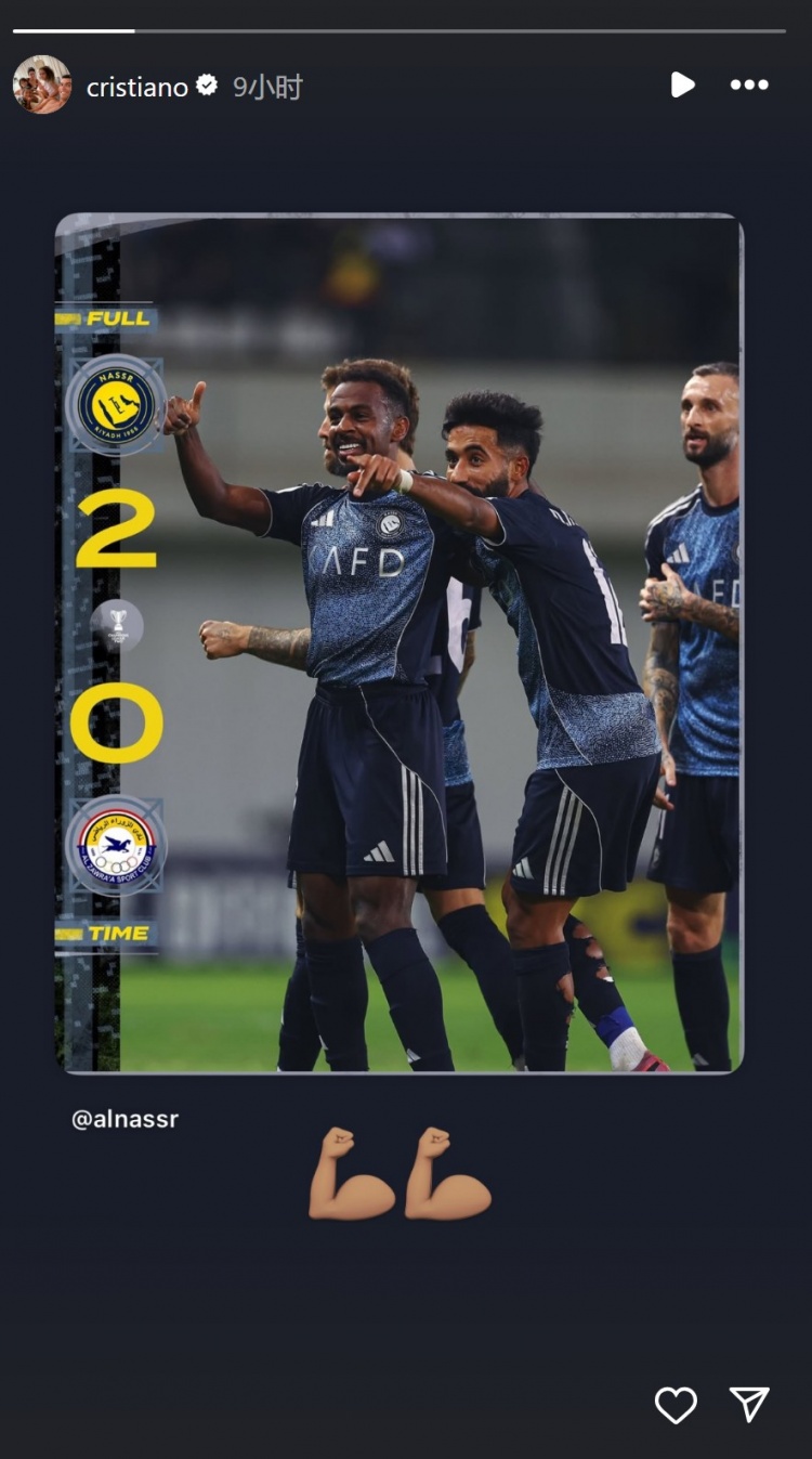 此役C罗轮休莫得出战,他在应对媒体上晒出比赛海报,庆祝利雅得顺利取胜。