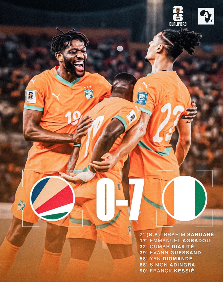 距寰球杯一步之遥!科特迪瓦7-0塞舌尔,朝上第二1分+11个净胜球