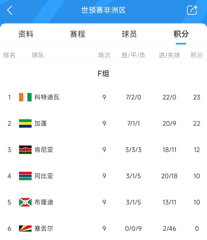 至此,在预选赛还剩1轮的情况下,科特迪瓦朝上第二加蓬1分+11个净胜球,主动权仍抓在手中。此外,除了9个小组第一纵贯寰球杯,非洲区9个小组中最佳的4个第二将角逐附加赛限额。