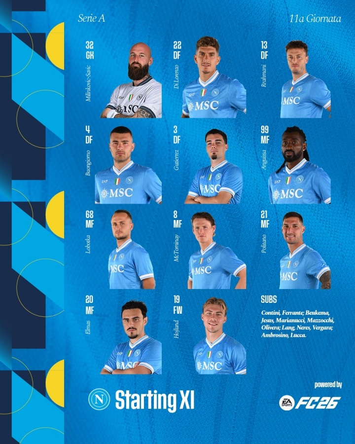 那不勒斯首发:32-瓦尼亚、22-迪洛伦佐、13-拉赫马尼、4-布翁乔尔诺、3-古铁雷斯、99-安古伊萨、68-洛博特卡、8-麦克托米奈、21-波利塔诺、20-埃尔马斯、19-霍伊伦