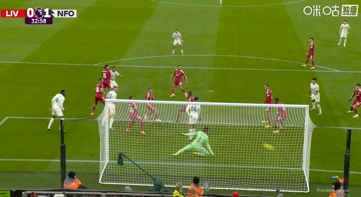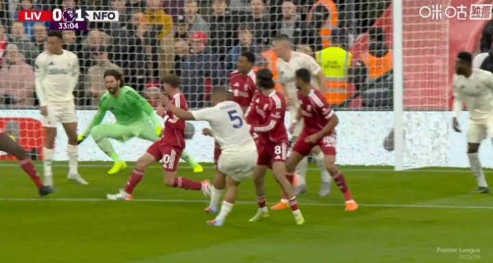 11月22日讯 英超第12轮,利物浦vs诺丁汉丛林,比赛第33分钟,诺丁汉丛林角球契机,穆里略破门。利物浦0-1落伍。但慢镜头知道,处于越位位置的恩多耶疑似骚动了阿利松的视野。