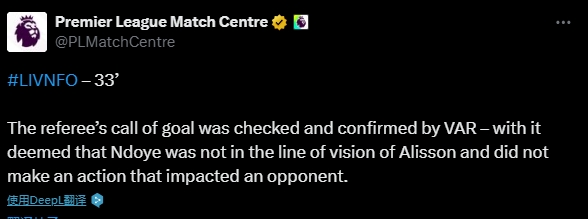 英超官方讲授谈:历程VAR查验和阐述,恩多耶不在阿利松视野范围之内,也莫得作念出影响敌手的看成。