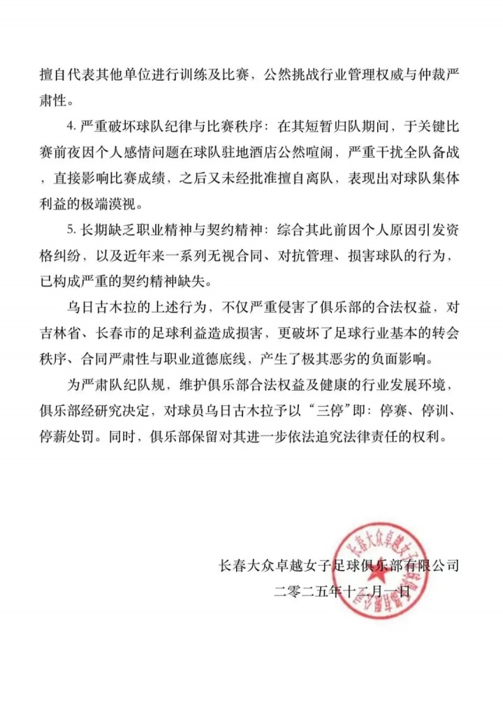 12月04日讯 女超俱乐部长春各人至极女足发布处罚晓谕,女足国脚乌日古木拉被“三停”处罚,触犯5项违规非法。