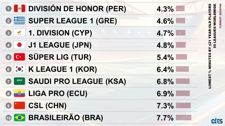 10月18日讯 近日,足球泰斗统计机构CIES发布最新统计,环球55个联赛中U21球员出场本事占比最少的联赛,秘鲁联赛4.3%居首,J联赛4.8%第4,K联赛6.4%第6,中超7.3%第9。