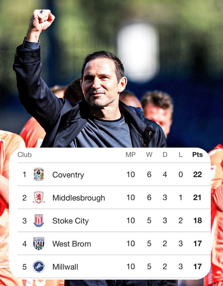 兰帕德执教考文垂本轮打败布莱克本,赛季10场不败高居英冠榜首