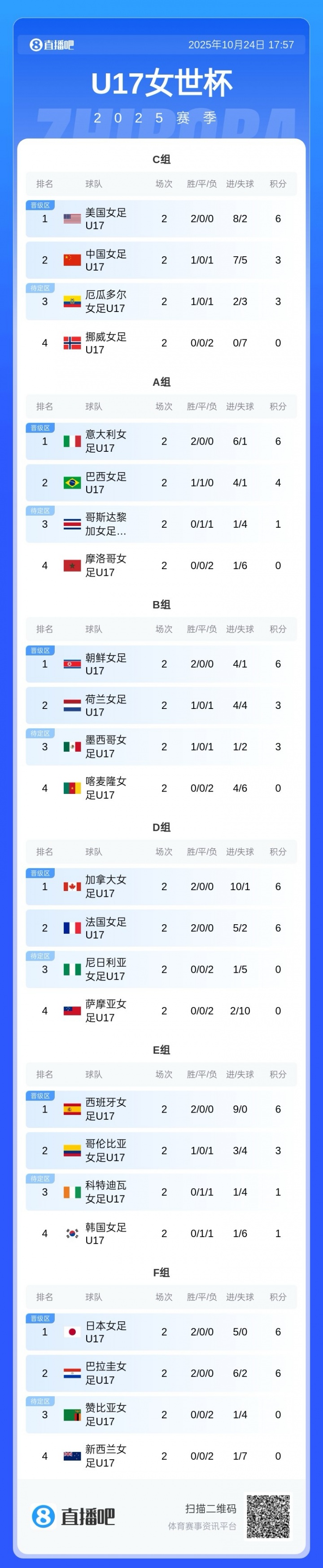 本届U17女足宇宙杯共有24队分为6个小组,每组前二以及4个收获最佳的小组第三构成16强。若中国女足U17末轮靡烂,则可能需要以小组第三的身份与其他队相比战绩。