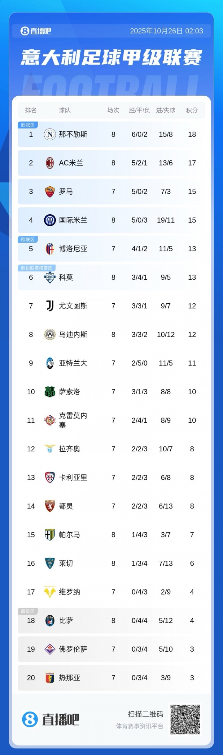 10月26日讯 本轮意甲,那不勒斯3-1击国米,最新积分榜情况如上图。