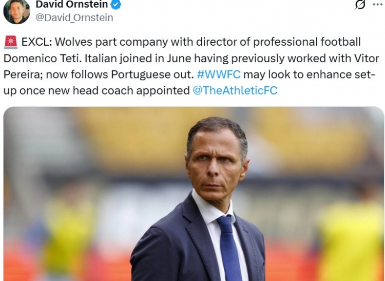 紧随主帅佩雷拉规律,奥恩斯坦:狼队总监多梅尼科-泰蒂去职
