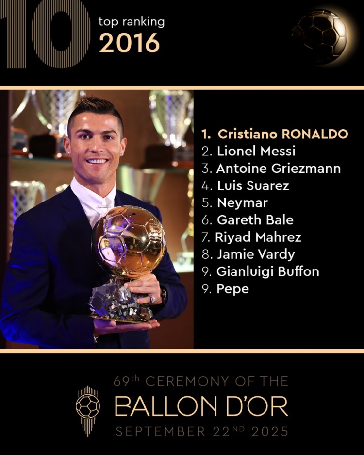 金球奖官方回来2016年前十名:C罗夺魁,梅西、格列兹曼二三位