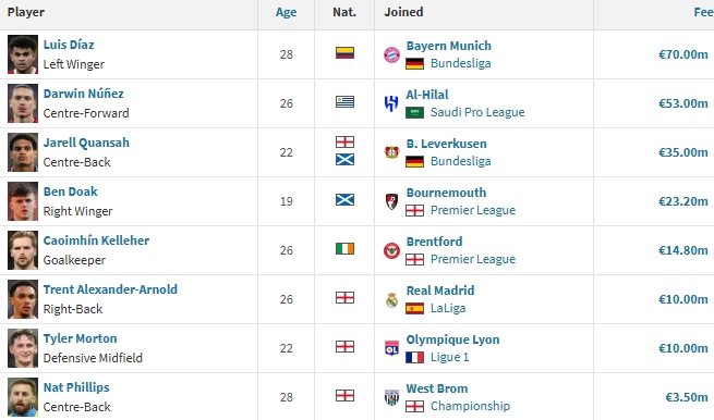利物浦今夏球员出售情况(盘算约2.195亿欧,不算浮动)↓