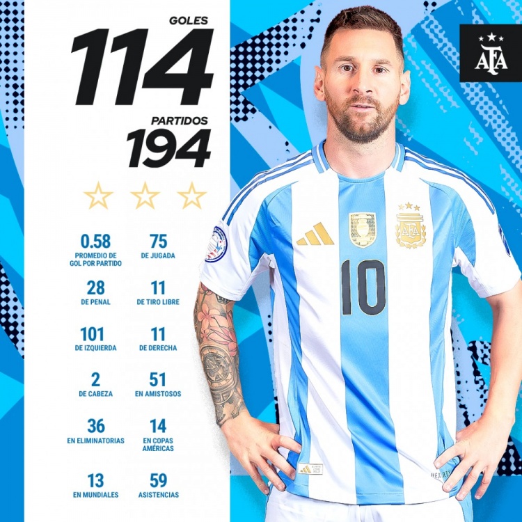 阿根廷队晒梅西数据:194场114球59助,世初赛36球&天下杯13球