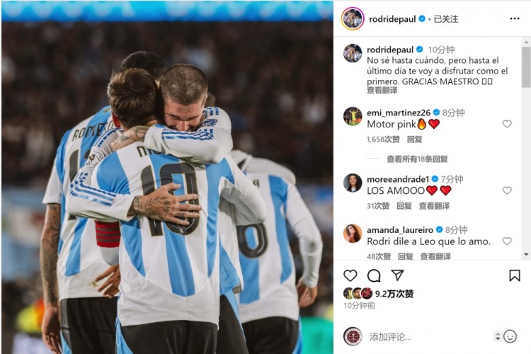 此役是梅西在国内终末一次为阿根廷队出战,德保罗社媒晒出拥抱梅西的相片,配文:“不知还有多久,但直到终末一天,我齐会像率先那样爱戴与你在一说念的时光。谢谢你,大师。”