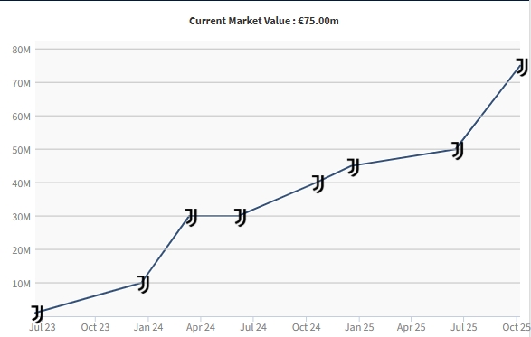 10月07日讯 当天德转更新意甲球员身价,20岁尤文边锋伊尔迪兹身价暴涨2500万,至7500万欧,置身意甲前三。