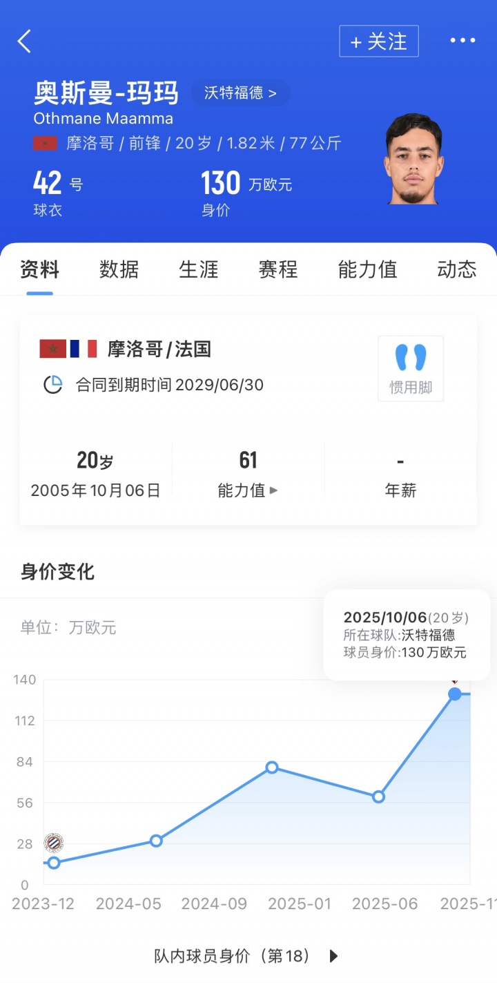 奥斯曼-玛玛当今身价130万欧。2024年升迁至蒙彼利埃一线队,投入14场比赛,打进2球并有1次助攻。本年夏窗,沃特福德以130万欧的价钱签下了他,但球员尚未在英冠得回出场契机。