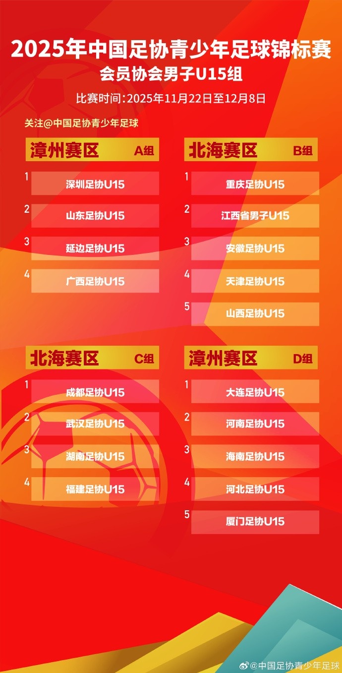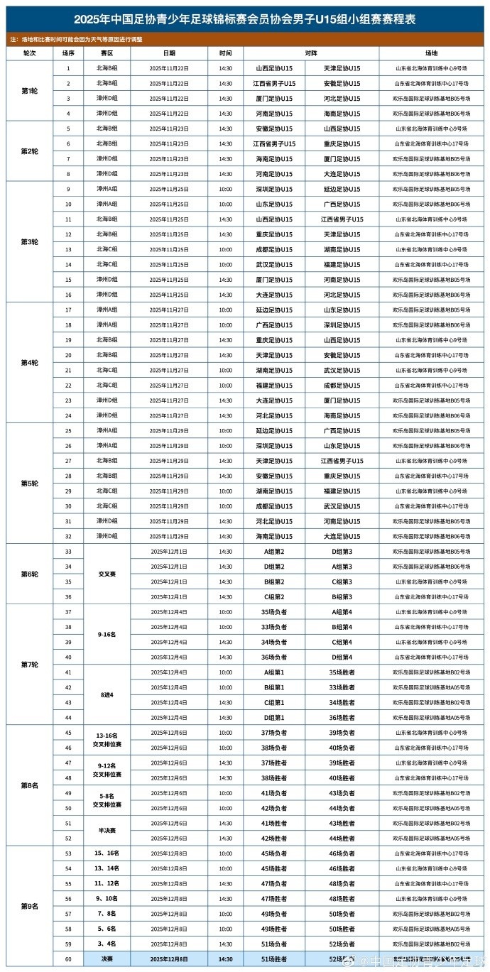 2025年中国足协青少年足球锦标赛 会员协会男人U15组分组+赛程表