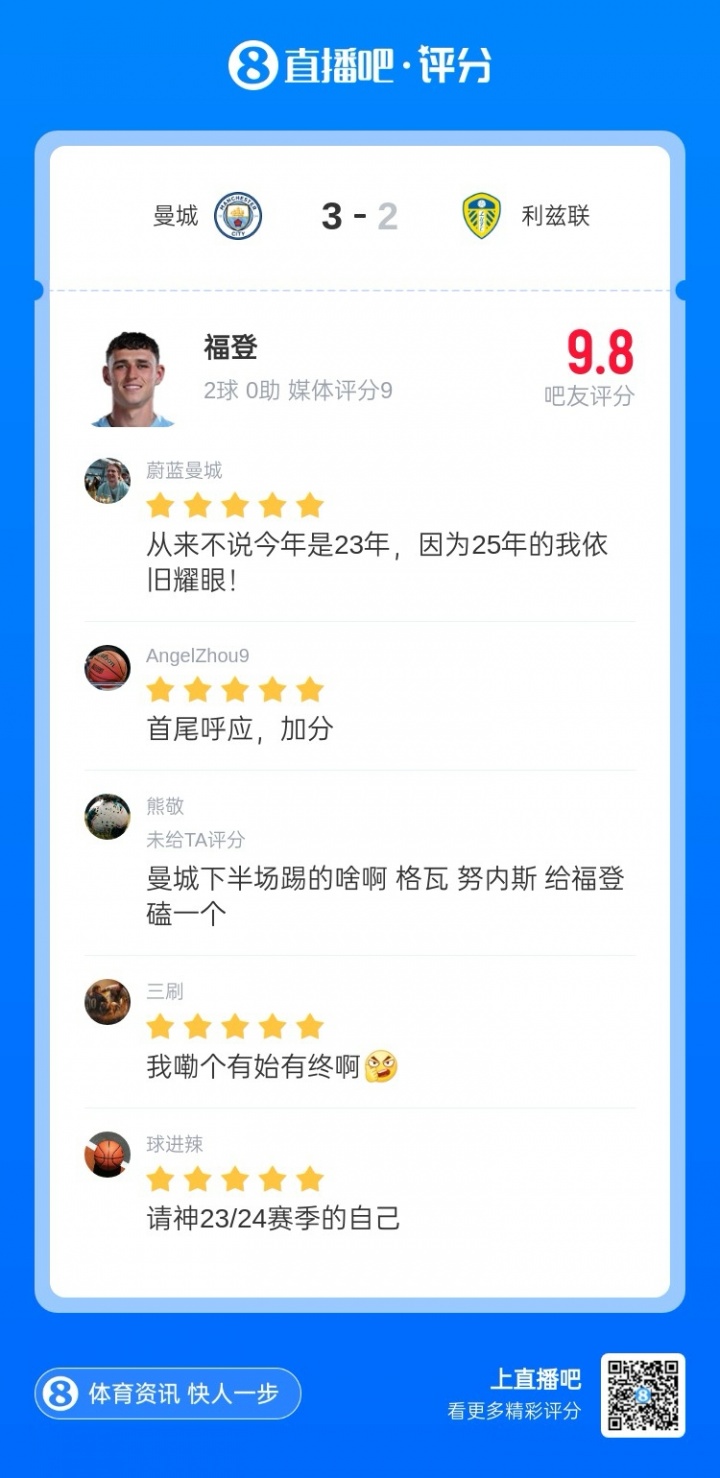 在曼城3-2战生效兹联的比赛中,福登双响+绝杀,强势宣告“太子”归来!福登得到吧友8.4万票,无悬念当选【X咪咕体育英超第13轮最好球员】!
