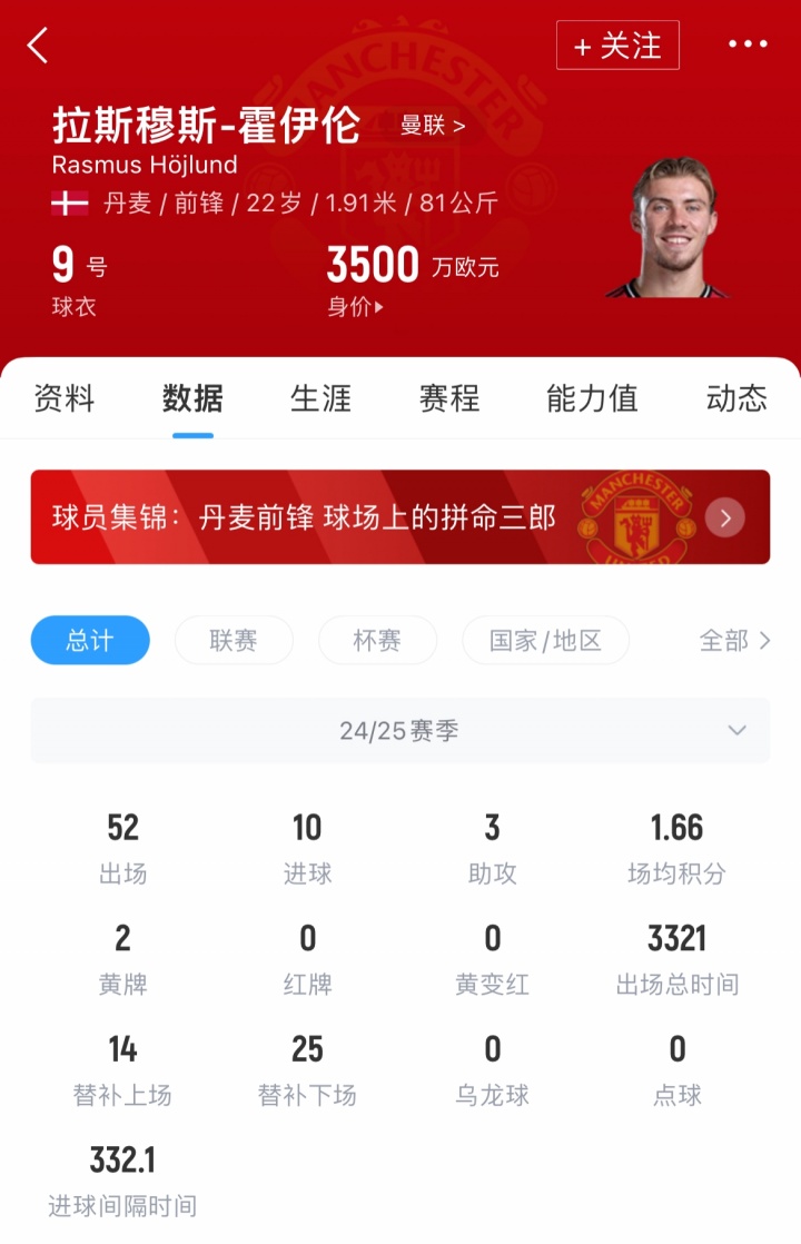 霍伊伦时年22岁,上赛季为曼联出场52场,得到10粒进球和3次助攻,当今其德回身价为3500万欧。