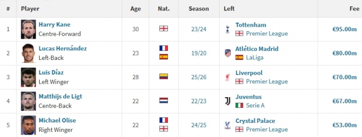 德国转会市集网站披露,拜仁队史引援记录当今由凯恩保有,拜仁在两年前以9500万欧的价钱将其引进。