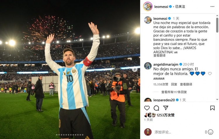 9月7日讯 梅西在Instagram发文谈国度队主场告别战,迪马利亚在评述区奉上道贺。