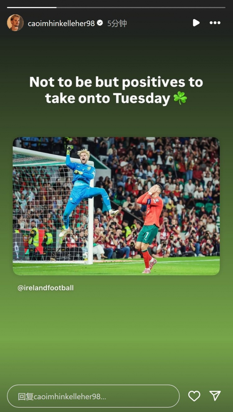 爱尔兰门将凯莱赫社媒晒扑出C罗点球后庆祝的像片,配文:“诚然未能称愿,但仍有积极身分不错带到周二的比赛之中(对阵亚好意思尼亚)。”