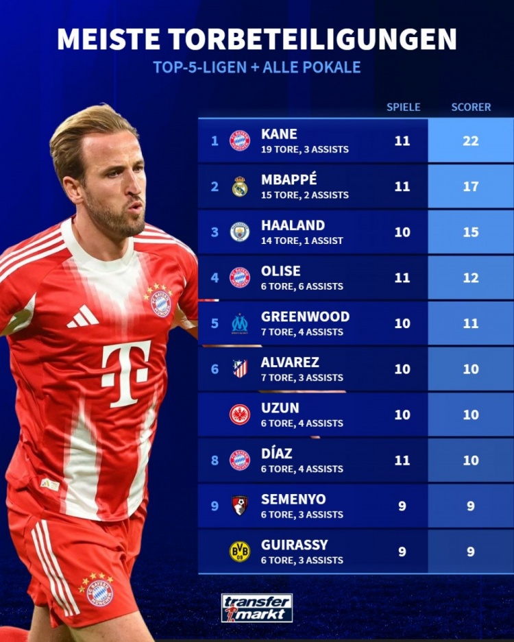 10月20日讯 《转会市集》统计了本赛季五大联赛球员在俱乐部各项赛事的径直参与进球总和情况,凯恩、姆巴佩、哈兰德分列前三。