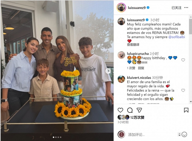 索菲亚迎来36岁诞辰,苏亚雷斯社媒晒出一家东谈主为她庆生的合照,配文:“孩子们的姆妈诞辰现象!你每过一岁诞辰,咱们齐为你感到愈加吹法螺,咱们的女王!🎂爱你今天到永久。”