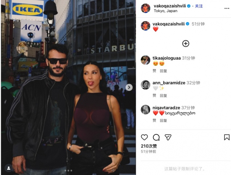 11月12日讯 本日,泰山队外助卡扎伊什维利更新社媒,晒出和太太愚弄海外比赛日的休赛期游览东京的像片。