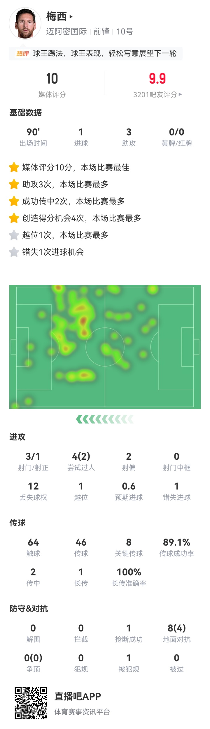 实至名归!梅西1射3助当选全场最好,季后赛球队3胜最好齐是他