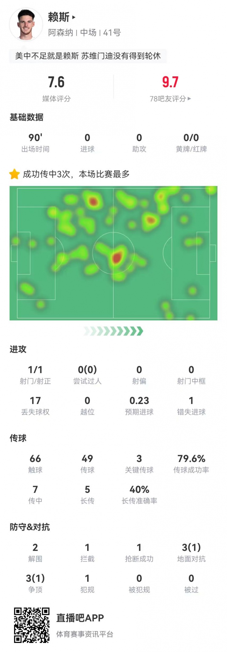 无处不在!赖斯本场1失良机 3关键传球2突围 6招架2到手 获7.6分