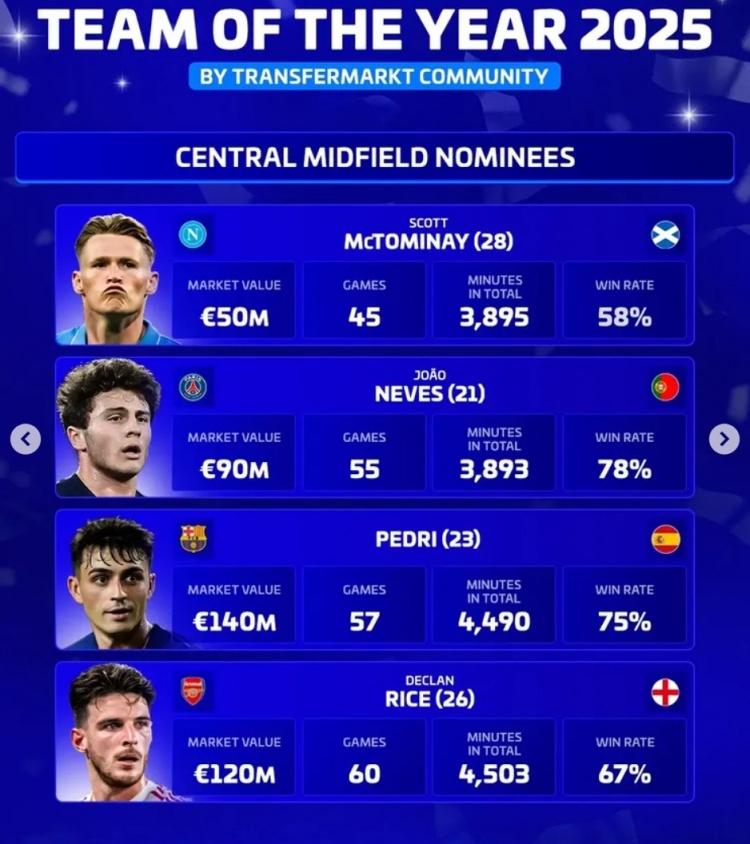 12月4日讯 《转会市集》评比2025年最好中时尚(万能中场),比肩出了4东谈主候选同期对比了他们的数据: