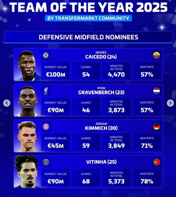 12月4日讯 《转会市集》评比2025年最好后腰(堤防型中场),比肩出了4东说念主候选同期对比了他们的数据: