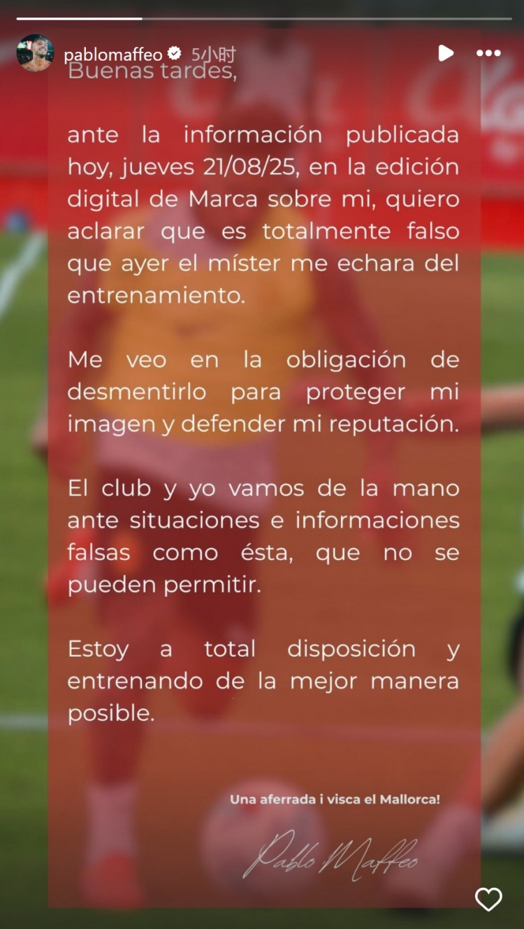 8月22日讯 马洛卡右后卫马菲奥更新社媒动态,否定我方被逐出查验的报说念。