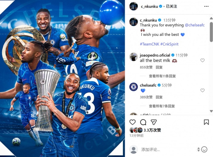恩昆库社媒写谈:“感谢切尔西俱乐部所作念的一切,为你献上最好意思好的祈福!”