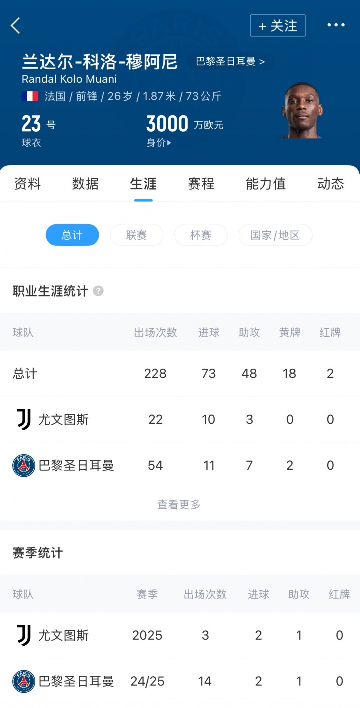 穆阿尼现年26岁,法国先锋。穆阿尼2023年夏窗9500万欧元从法兰克福加盟巴黎,上赛季被巴黎租赁至尤文图斯。遵守尤文时代球员出场22次,孝敬10球3助。当今穆阿尼德回身价为3000万欧元。